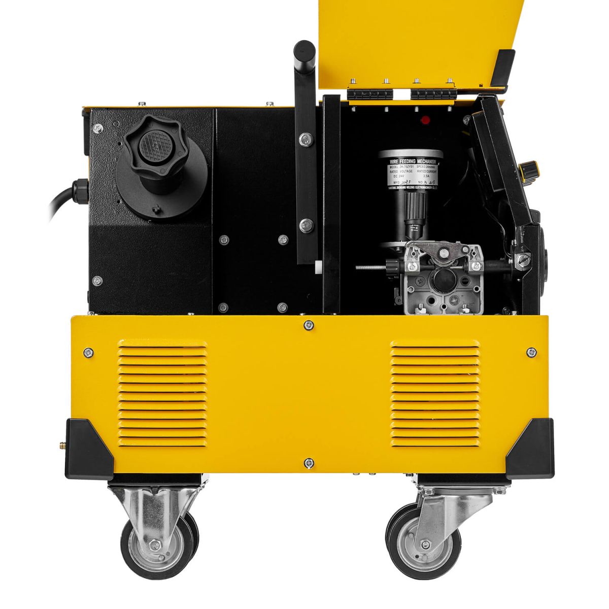 - Металлический механизм подачи проволоки. Используется сварочная проволока диаметром от 0,8 до 1,2 мм. Можно установить катушку с проволокой весом до 18 кг (D300) и регулировать скорость подачи проволоки от 3 до 16 м/мин.